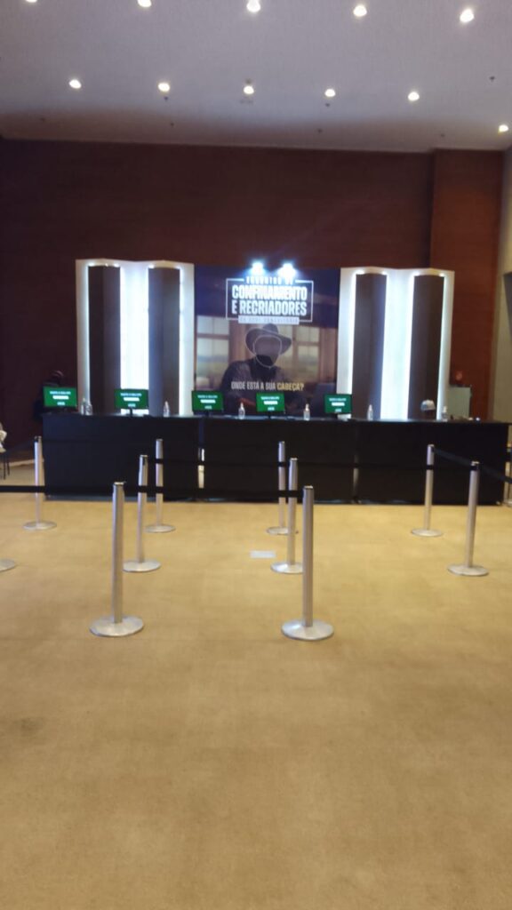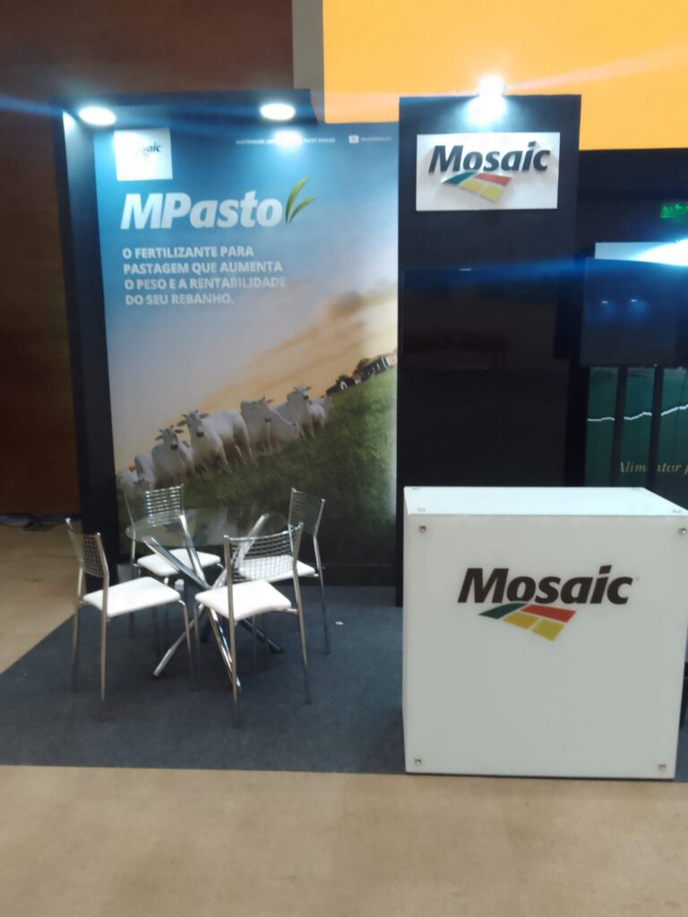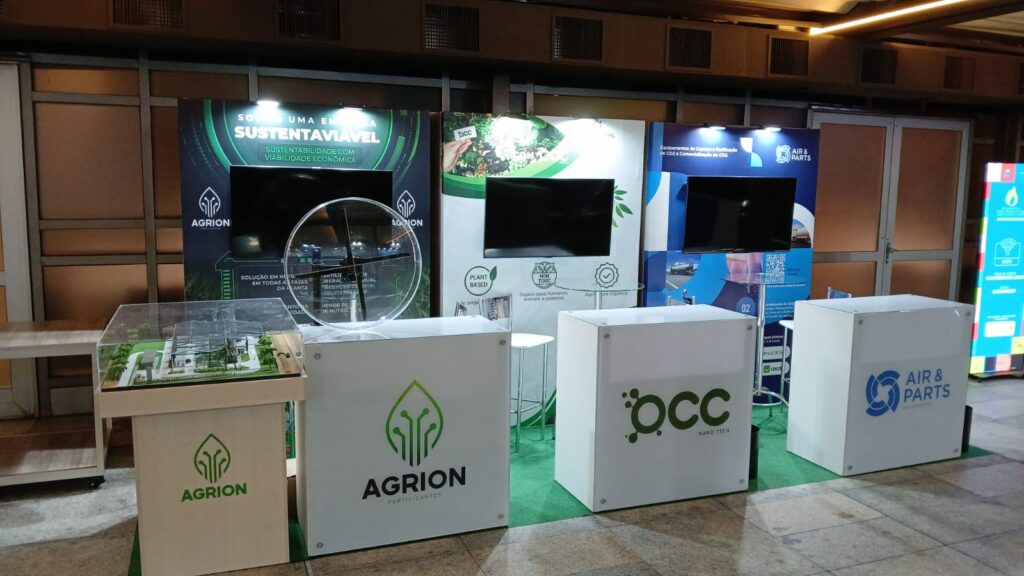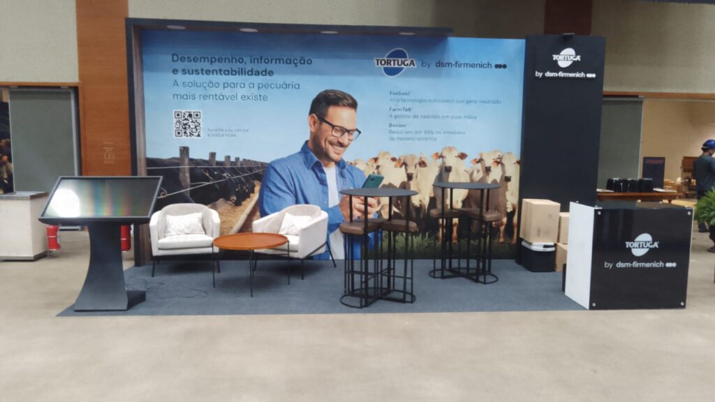 Mesmo dentro de um modelo padronizado de montagem, cada expositor mantém sua identidade visual por meio de comunicação gráfica personalizada, painéis institucionais, iluminação direcionada e mobiliário estratégico.